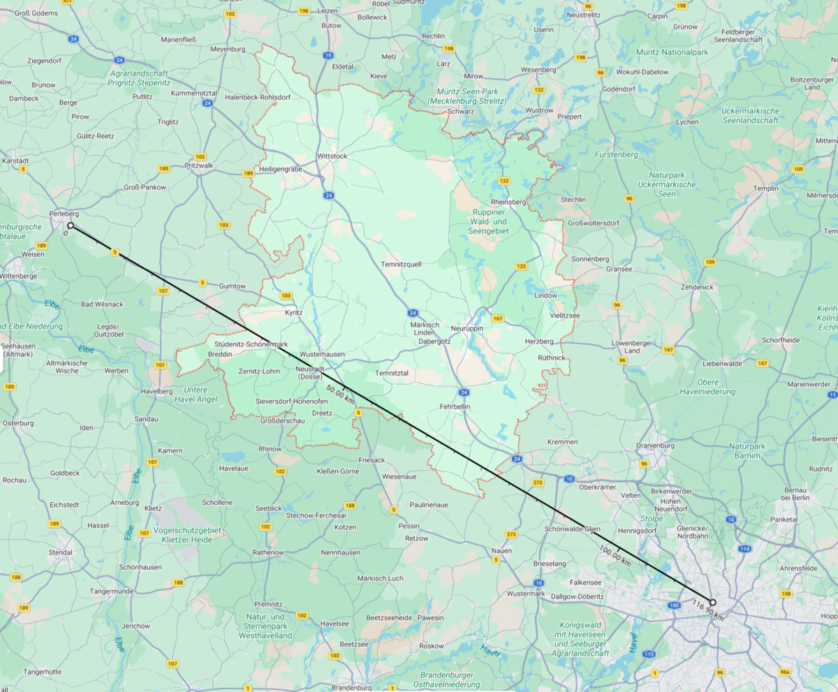 Von Perleberg (Kreisstadt von Prignitz) nach Berlin, sind es ca. 120 Kilometer, was derzeit mit der Bahn per direktem Regional Express ca. zweieinhalb Stunden in Anspruch nimmt.